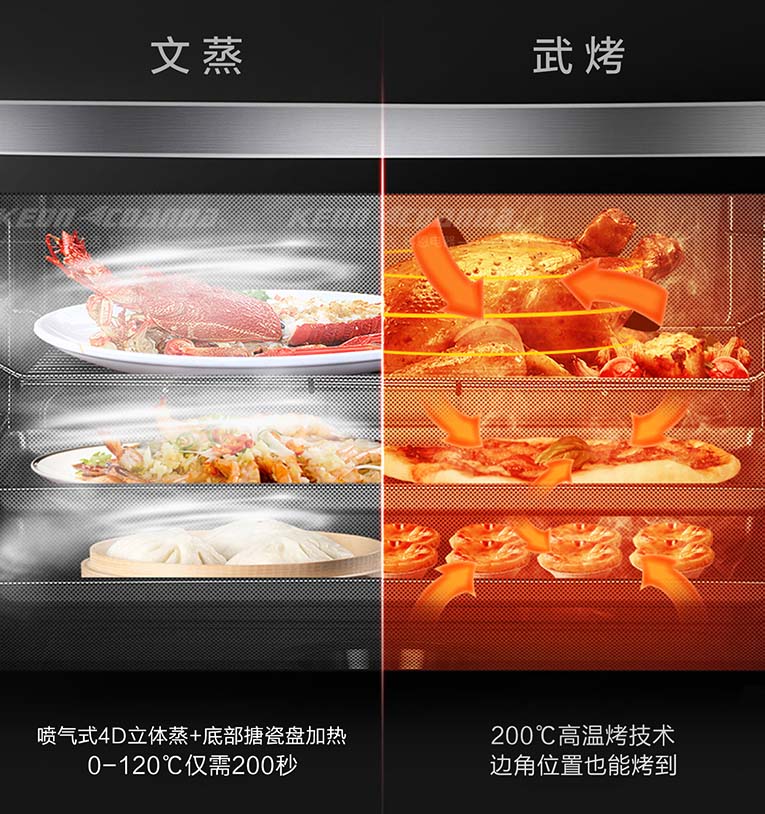 與此同時,科恩智能變頻大吸力集成灶5.0KW強勁火力,大火夠猛,小火夠穩,雙聚能環設計,熱量不流失,讓愛爆炒的用戶充分享受大火力帶來的極致體驗??呻S心調節火力大小,大火猛、小火穩,爆炒、蒸煮、燜燉等各種烹飪方式都能得心應手,給用戶們帶來暢爽的烹飪體驗,讓美食一觸即發,美味全新升級!為解決更多烹飪需求,科恩智能變頻大吸力集成灶下方搭載62L黃金容量蒸烤箱,4D立體直噴式蒸烤模式,受熱跟更均勻,頂部不滴水,智能恒溫蒸烤,多種食物不串味并保證美食色澤亮麗,營養不流失!