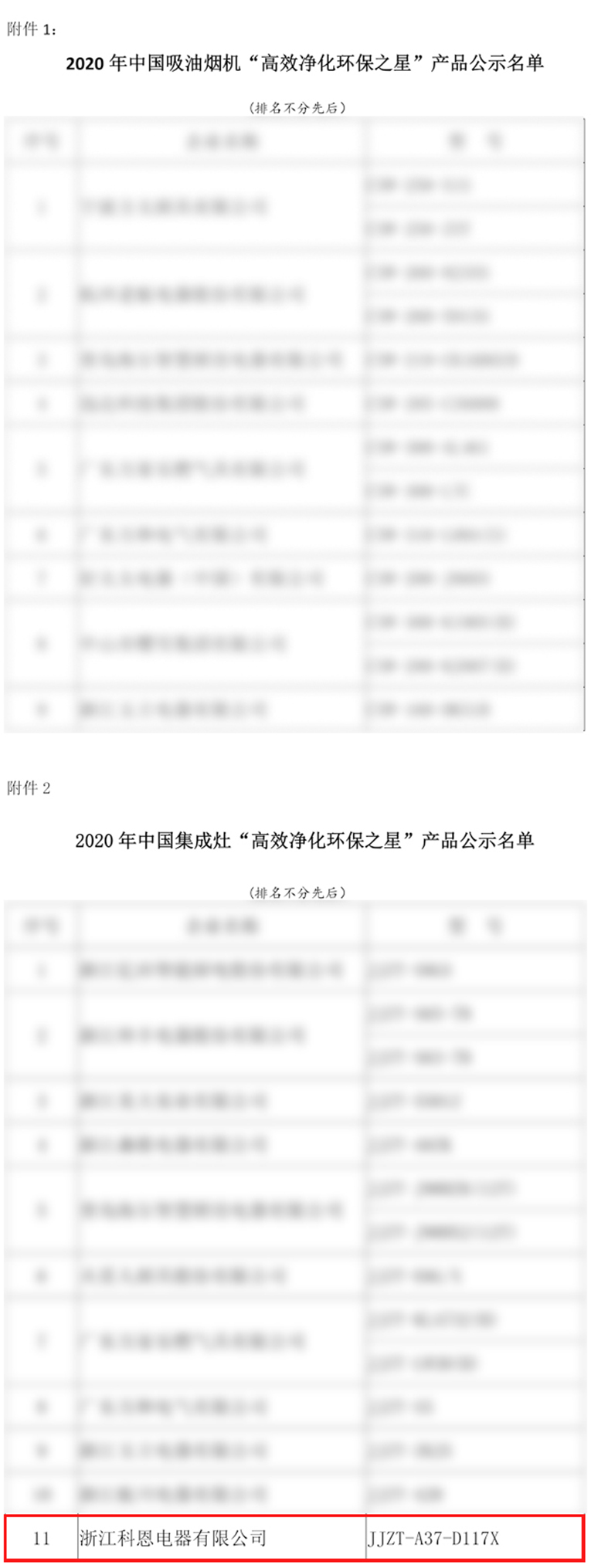 近日,由中國五金制品協(xié)會組織2020年度中國吸油煙機(jī)、集成灶“高效凈化環(huán)保之星”評比中,科恩智能變頻集成灶D117X憑借較高的油煙吸凈率及油煙分離率榮膺“高效凈化環(huán)保之星”的稱號!