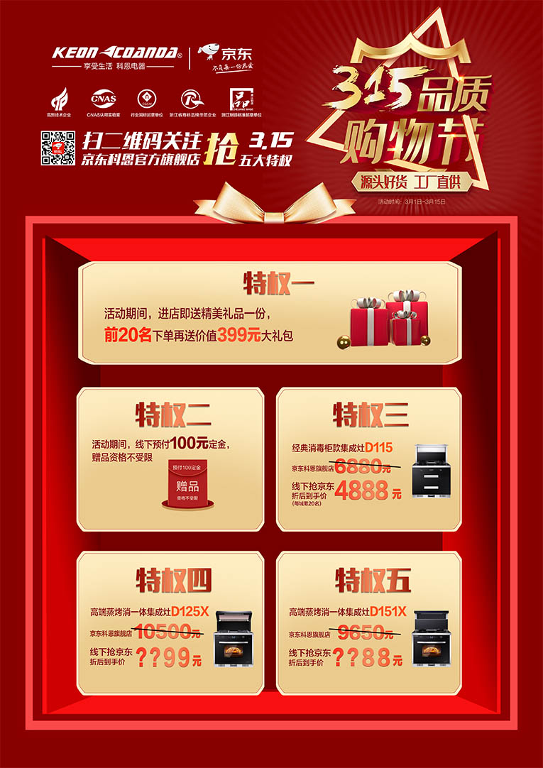 集成灶十大品牌、廚電行業(yè)十大品牌科恩電器315品質(zhì)購物節(jié),3月1日至3月15日活動期間,關(guān)注京東科恩官方旗艦店搶3.15五大特權(quán)!特權(quán)一:凡進(jìn)店客戶,即送精美禮品一份,前20名下單再送價值399元大禮包;特權(quán)二:活動期間線下預(yù)付100元定金,贈品資格將不受限;特權(quán)三:經(jīng)典消毒柜款集成灶D115京東科恩旗艦店6880元,線下?lián)尵〇|折后到手價4888元;特權(quán)四:高端蒸烤消一體集成灶D125X、D151X線下?lián)尵〇|折后到手價低到你不能想象!