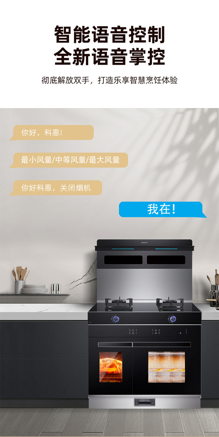 集成灶十大品牌、廚電行業(yè)十大品牌科恩S450智能語音左右蒸烤集成灶S級(jí)豪華轎車品質(zhì),七彩氛圍燈百變機(jī)身,彰顯高端大氣,能與不同家居裝修風(fēng)格相適應(yīng),輕松打造幸福夢(mèng)想廚房。