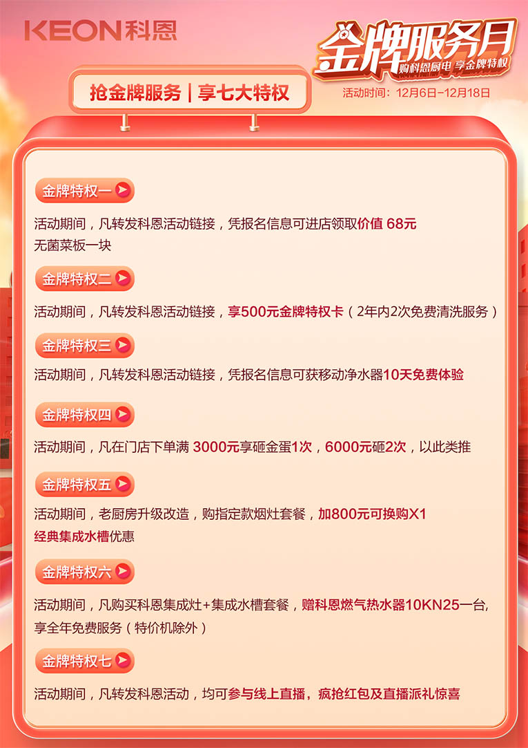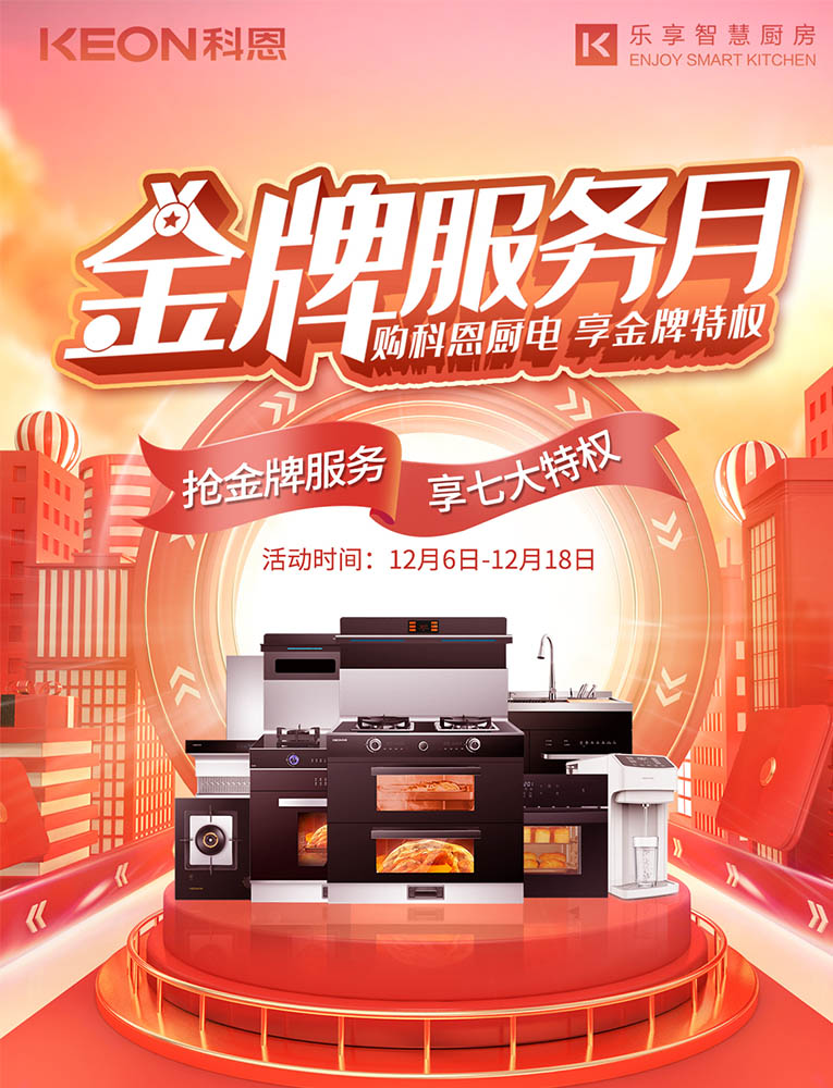 科恩“金牌服務月”經過精心籌備盛大開啟,購科恩廚電,享金牌特權!以領軍者姿態(tài),開啟行業(yè)服務新典范。用戶不但可以通過科恩全國專賣店直接獲取服務,還可以通過線上報名、砍價形式獲得權益,結合線下門店金牌服務,聚焦客戶最及時服務需求,七大特權限時搶購!