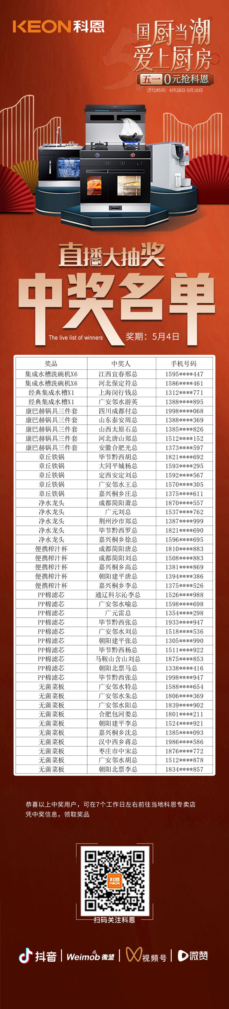 國(guó)廚當(dāng)潮,愛(ài)上廚房——0元搶科恩活動(dòng)正在火爆進(jìn)行中,為回饋消費(fèi)者,科恩電器特于5月4日晚舉行了直播大抽獎(jiǎng)活動(dòng)。