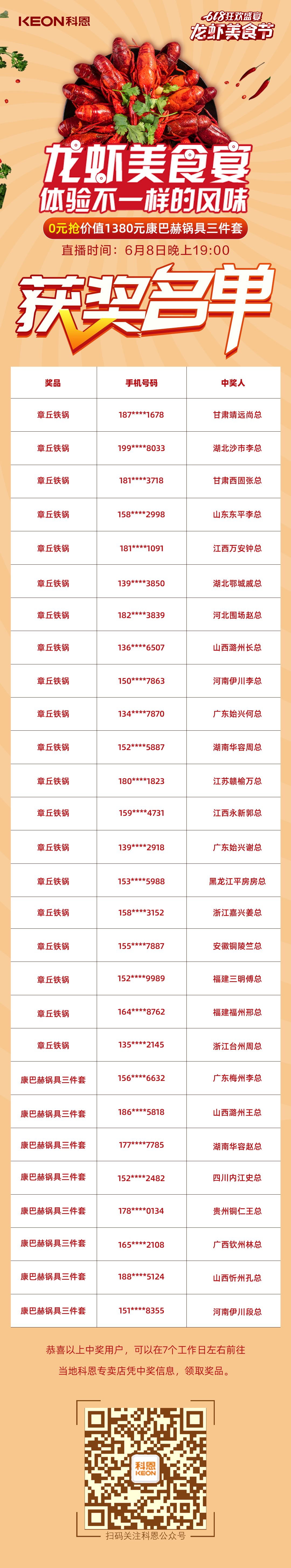 話不多說,先來公布6月8日晚龍蝦美食宴直播現場中獎名單,恭喜以下28位幸運寶寶!請在七個工作日左右,憑中獎信息到當地科恩專賣店領取您的專屬獎品!沒有中獎的寶寶也不用氣餒,沒準下一期的直播大獎就在向你招手!你就是幸運錦鯉本鯉!