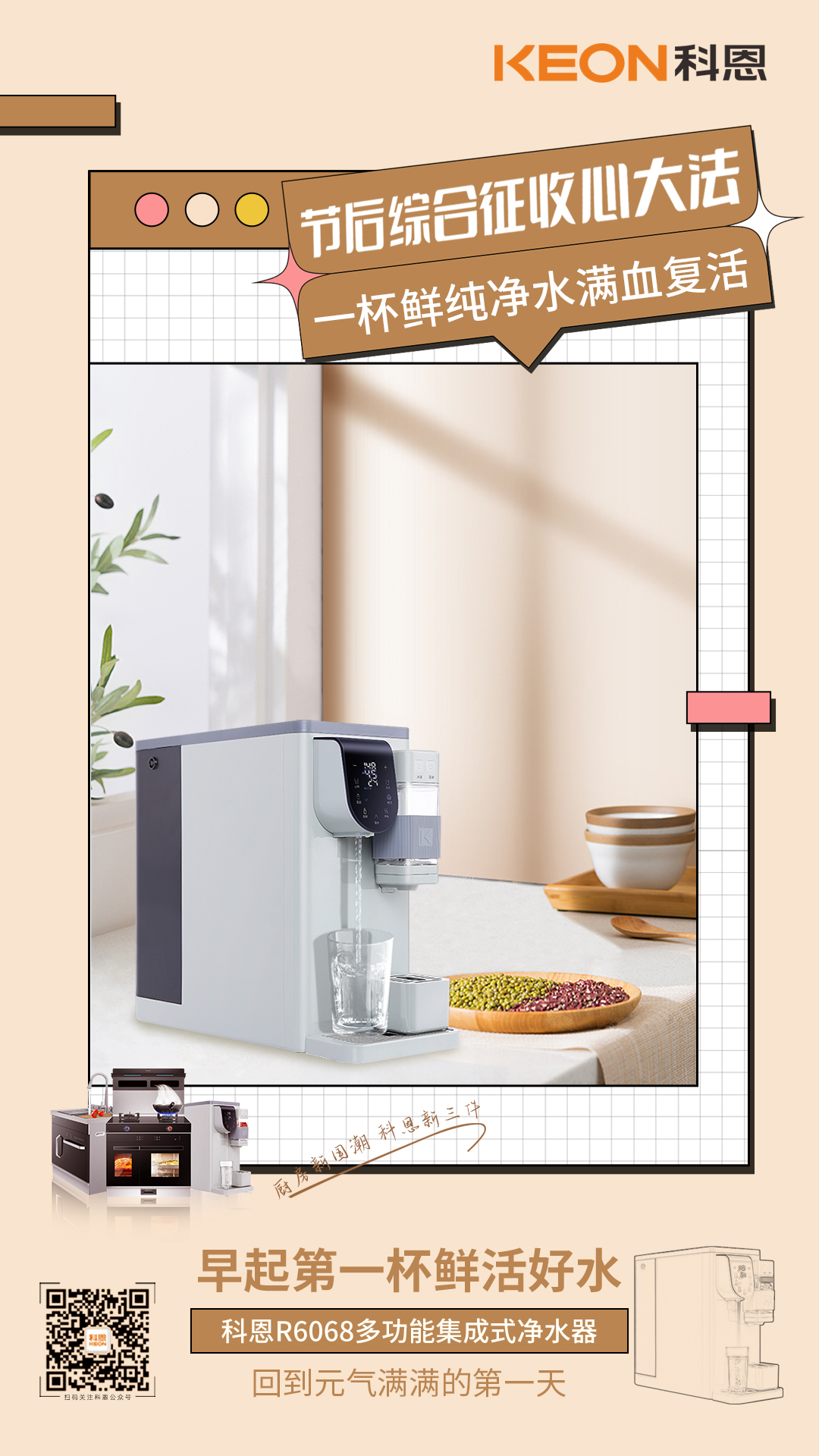 國慶長假,熬夜晚起定時(shí)常態(tài),你需要一杯鮮活好水,煥新身體細(xì)胞,回到元?dú)鉂M滿的第一天!科恩R6068多功能集成式凈水器,一鍵適配不同飲水需求,溫度水量皆可調(diào)控,百變泡飲,滴滴鮮醇,RO精濾,UV殺菌,精濾至微,暢飲無憂,健康隨行!