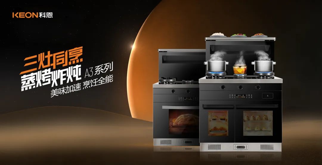 配合現代人快節奏生活,科恩研發了A3系列集成灶,不僅可以做到三灶同烹,還能同時蒸烤,15分鐘一桌美食,不再是愿望。