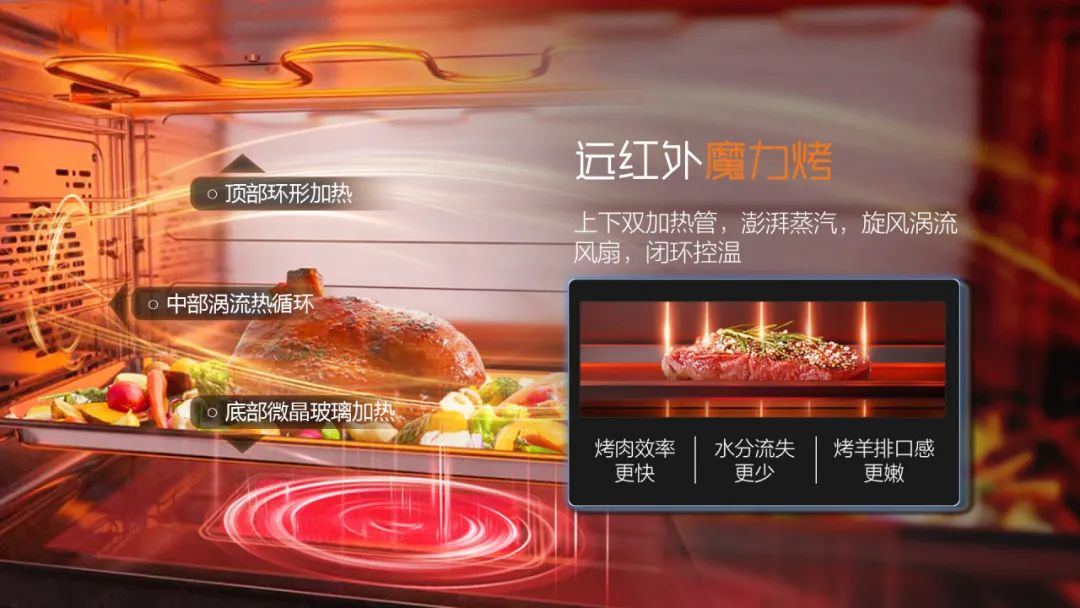 科恩A3系列集成灶,采用上下雙加熱管,澎湃蒸汽,旋風渦流風扇,閉環控溫。讓每一份烤肉在噴香焦嫩的同時還保存肉質的水分,酥香而不柴!