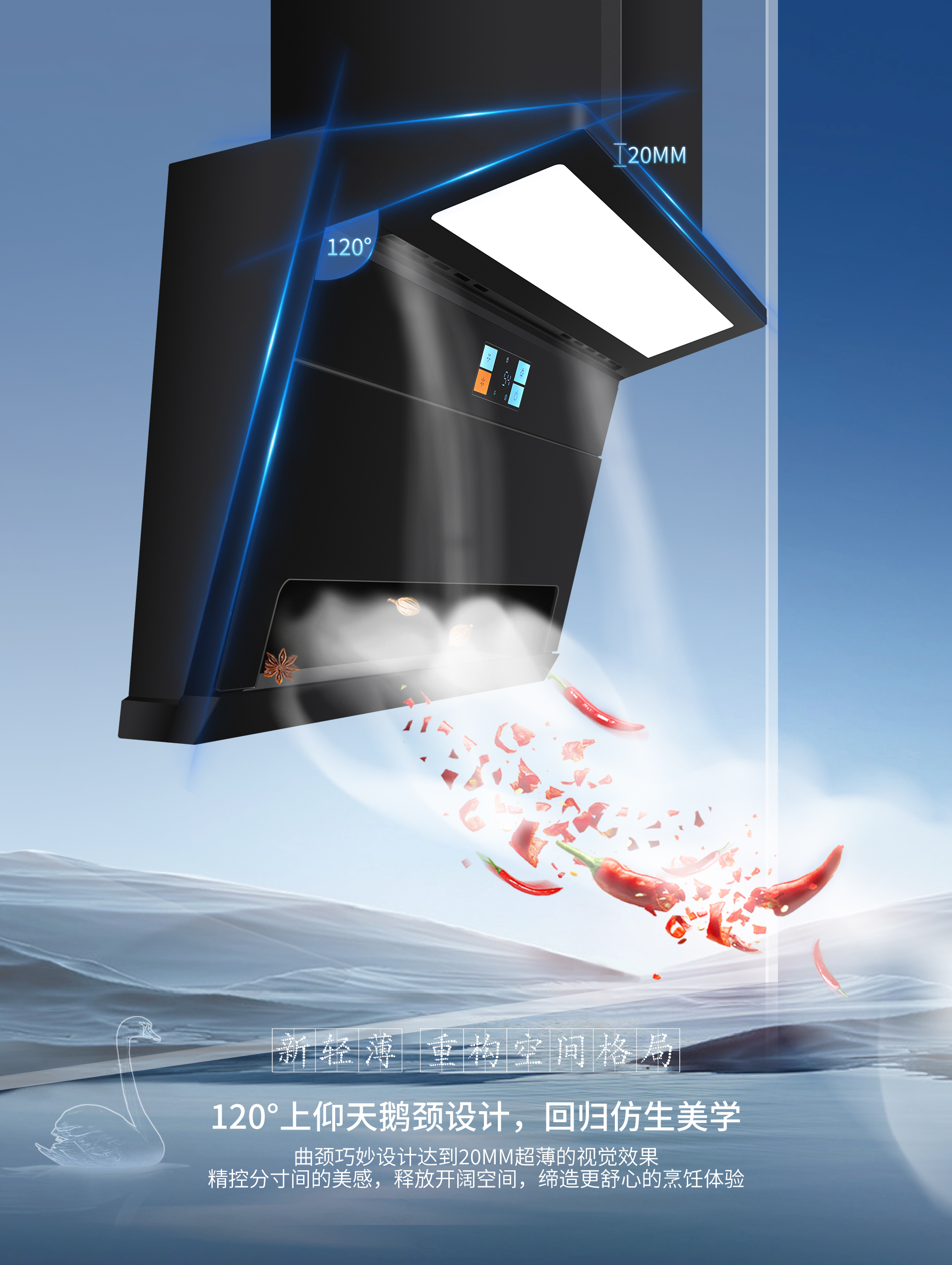 科恩7730智能聯(lián)動煙機整機采用特氟龍工藝,一體成型的設計,不僅使其具備不沾油的卓越特性,更在外觀上顯得格外美觀。這種獨特的工藝處理,讓廚房器具在日常使用與清潔過程中都變得輕松便捷,始終保持著光潔如新的狀態(tài),為廚房增添了一份精致與高雅。其新輕薄的設計重構了廚房的空間格局。120°上仰天鵝頸設計堪稱一大亮點,曲頸的巧妙構造營造出2.0cm超薄的視覺效果。在精控分寸之間展現(xiàn)出無與倫比的美感,同時釋放出開闊的空間,讓烹飪者能夠在寬敞舒適的環(huán)境中盡情施展廚藝,締造更為舒心愉悅的烹飪體驗。