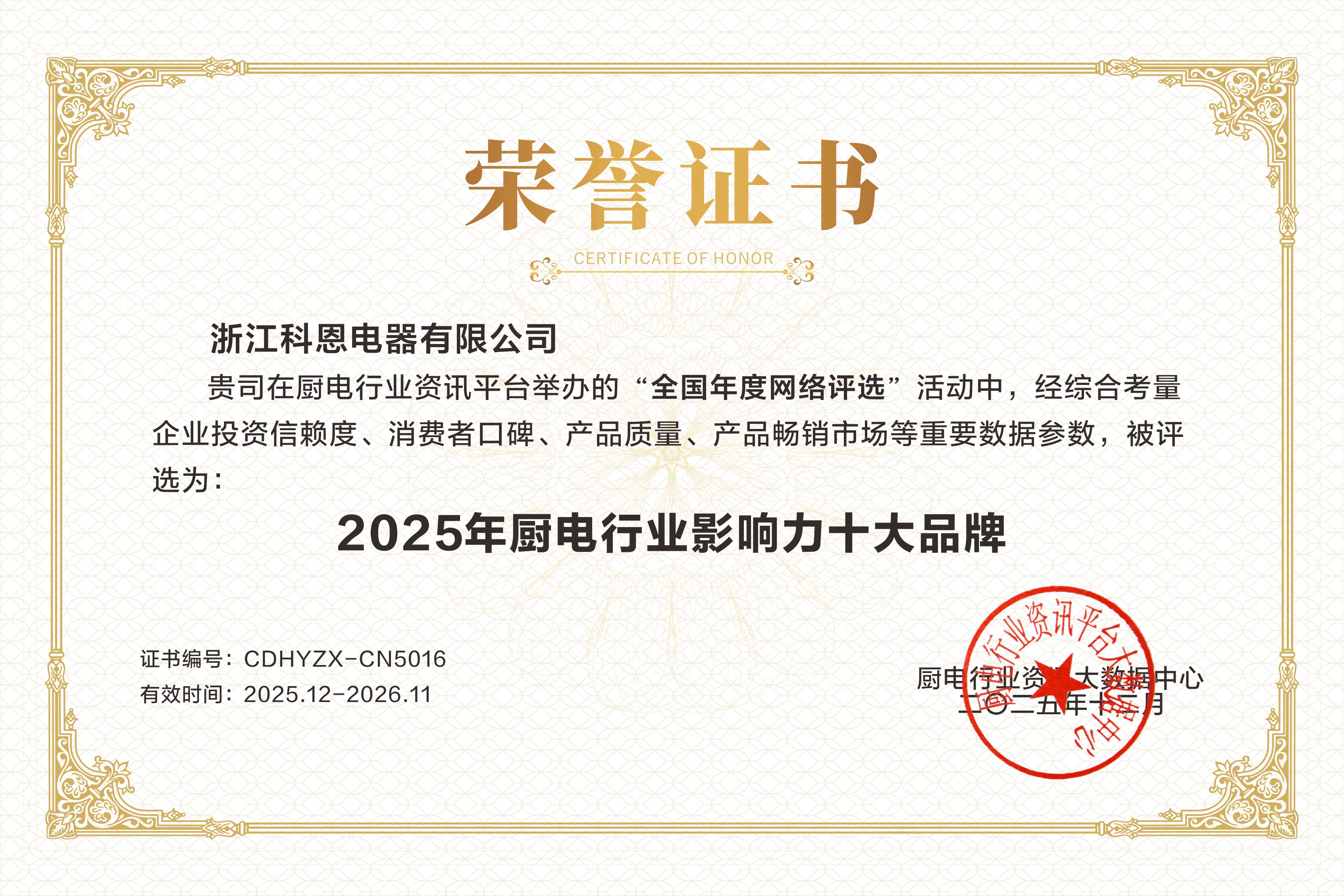 每一次獲獎,都是對過去的總結(jié),更是對未來的承諾。科恩電器感謝每一位用戶的信賴與選擇,感恩行業(yè)伙伴的認可與同行。站在新的高度,科恩將承載這份榮耀與期待,繼續(xù)秉持匠心與創(chuàng)新精神,不僅致力于提升中國家庭的廚房生活品質(zhì),更愿與行業(yè)一同成長,共同推動廚電產(chǎn)業(yè)邁向更高水平的發(fā)展征程。