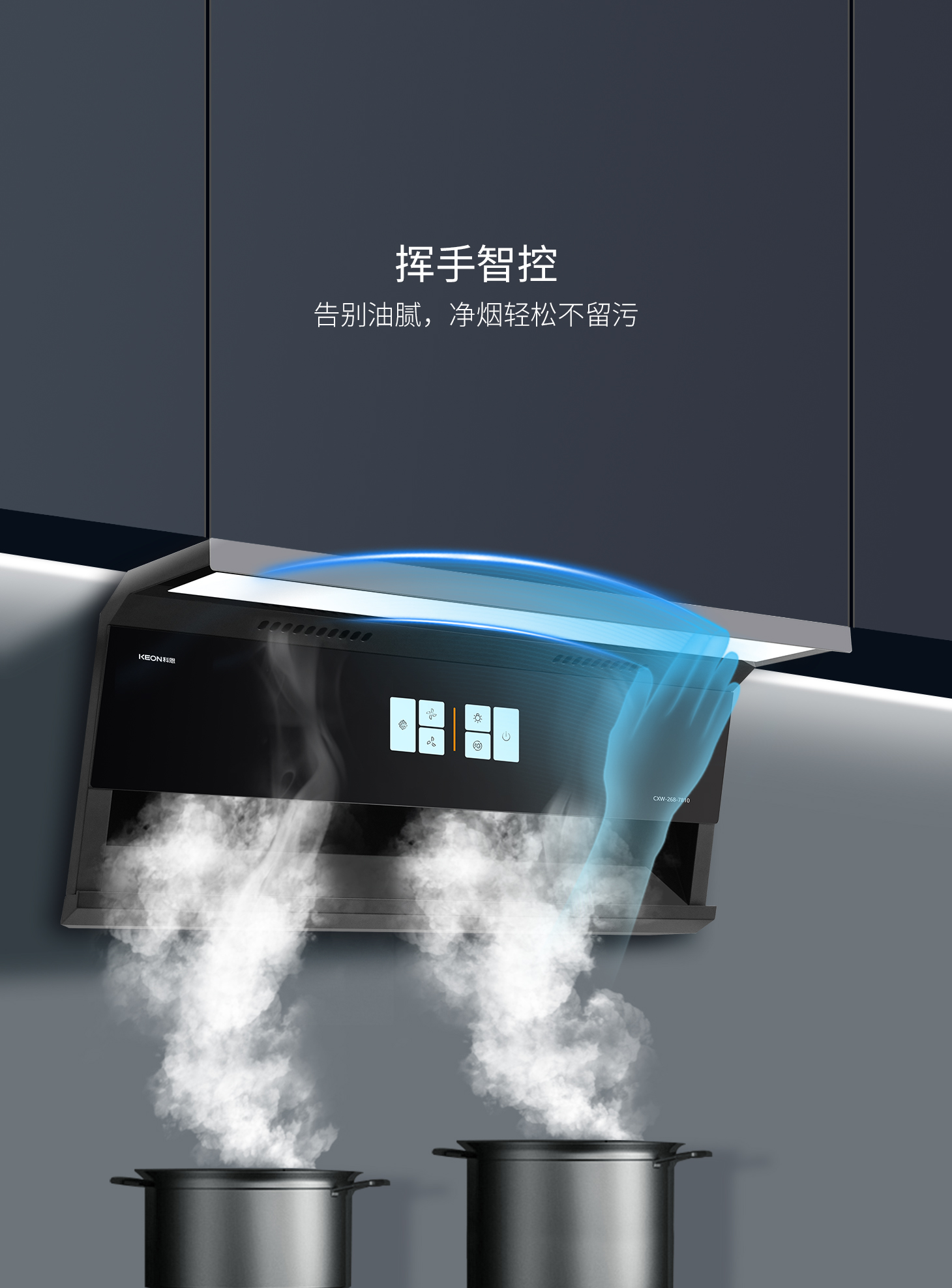 凈煙神速 顏值擔當。新年爆炒,油煙無蹤,3秒清場,全域攏煙,1350Pa變頻風壓,排煙順暢。2.5cm輕薄機身,冰川灰鑲邊,天鵝頸設計,釋放開闊空間,揮手智控,凈煙不沾油污。易潔省心 健康相伴。特氟龍工藝,油污不粘。智旋清洗,吸力持久強勁。3分鐘延時關機,余煙盡除,IP67全景天幕,護眼清晰,模塊化觸控,操作直觀簡單,0.5立方大空間,翻炒不碰頭。