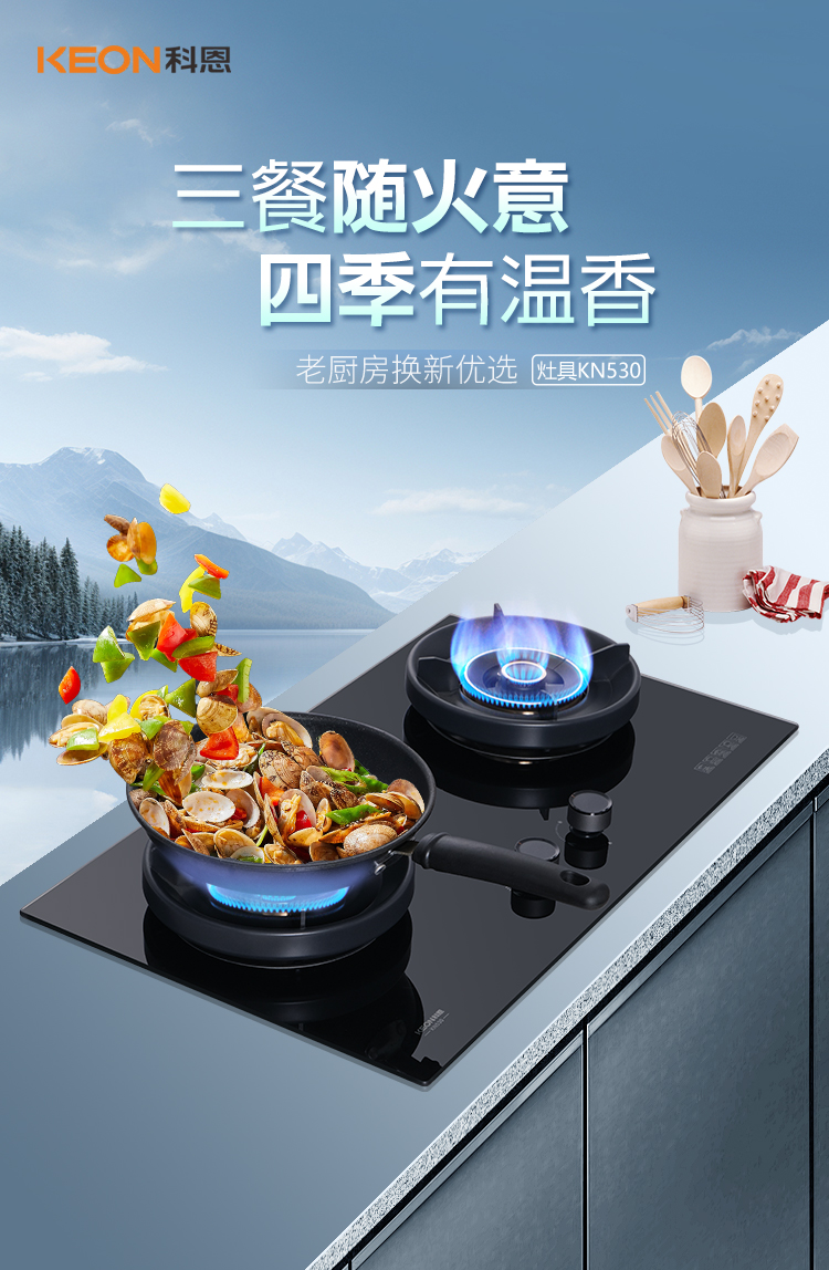 安全省心,長效耐用。意外熄火保護,火滅氣斷無隱患。航空級燃燒系統,抗腐不變形更持久。可拆卸部件設計,清潔維護超簡單。70%新標能效,節能環保雙達標。鋁合金爐頭防堵防銹,使用壽命再延長。日常烹飪放心用,省心耐用無煩惱。煥新正當時,煙火更舒心。新標換灶選科恩,健康節能雙保障。KN520雅廚適配,KN530格調升級。無煙烹飪自由呼吸,省氣省心更安心。告別老灶痛點,讓烹飪回歸從容愉悅,科恩雙款新灶,守護全家三餐溫香!